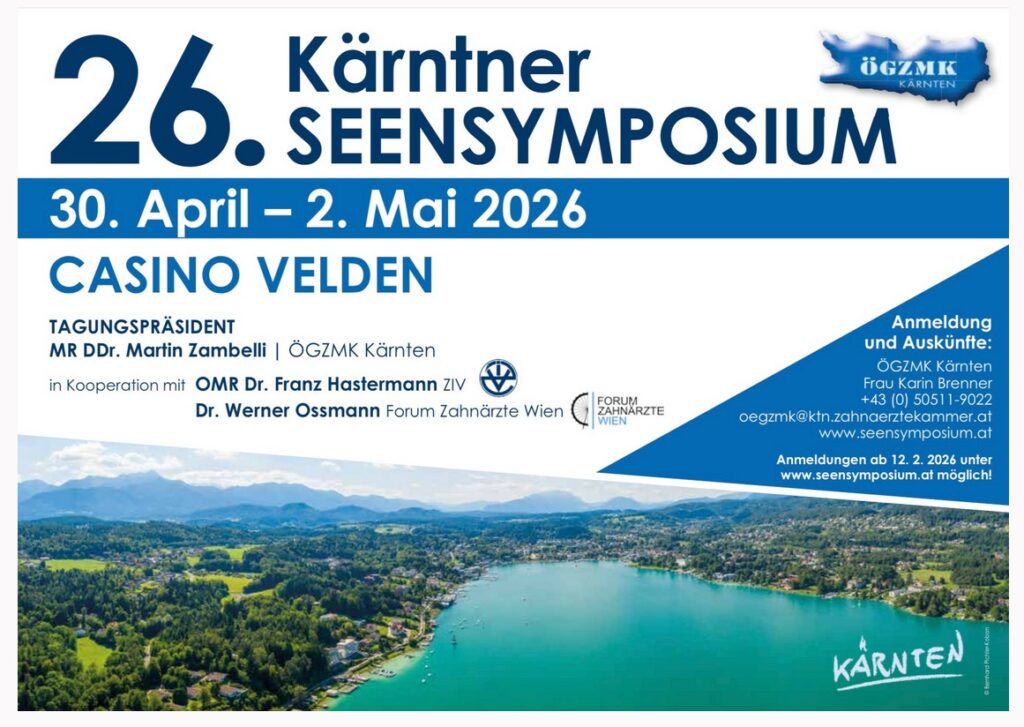 26. Kärntner Seensymposium Ordination für Zahnerhaltung | Veröffentlicht am 17. Februar 2026 | 30. April bis 02. Mai 2026, Kongress für Zahnmedizin am Wörthersee Programmheft Zimmerreservierung ONLINE ANMELDUNG HIER Beitragsnavigation ← Vorheriger Beitrag